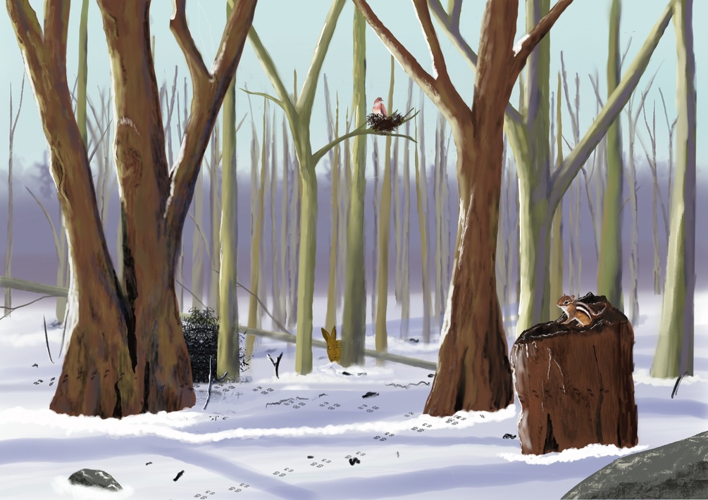 Background soft greyish blue sky with distant tree area in lavender colour. Most mid area trees in a muted lite greenish colour. Foreground two dark ground large trees and a tree stump with Chipmunk. Centre area, a. Rid inn a nest. Below a small rabbit peeking out from behind tree. Snowy ground with tree shadows.